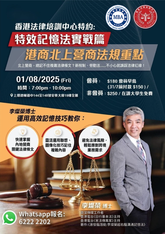 2025年8月1日 @ 7:00 上午 - 10:00 下午 特效記憶法實戰篇|港商北上營商法規重點 安泰大廈 上環德輔道中144至148號安泰大廈19樓全層 💡 活動簡介 北上營商,總記唔住複雜嘅內地法律條文?新稅制、…